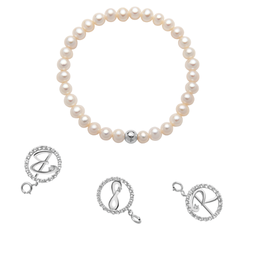 Miluna-Anhänger aus rhodiniertem 925er Silber, runde Form mit dem Buchstaben G, verziert mit weißen Topasen, der an das Miluna-Perlenarmband aus der Natural Brio-Kollektion angebracht werden kann.