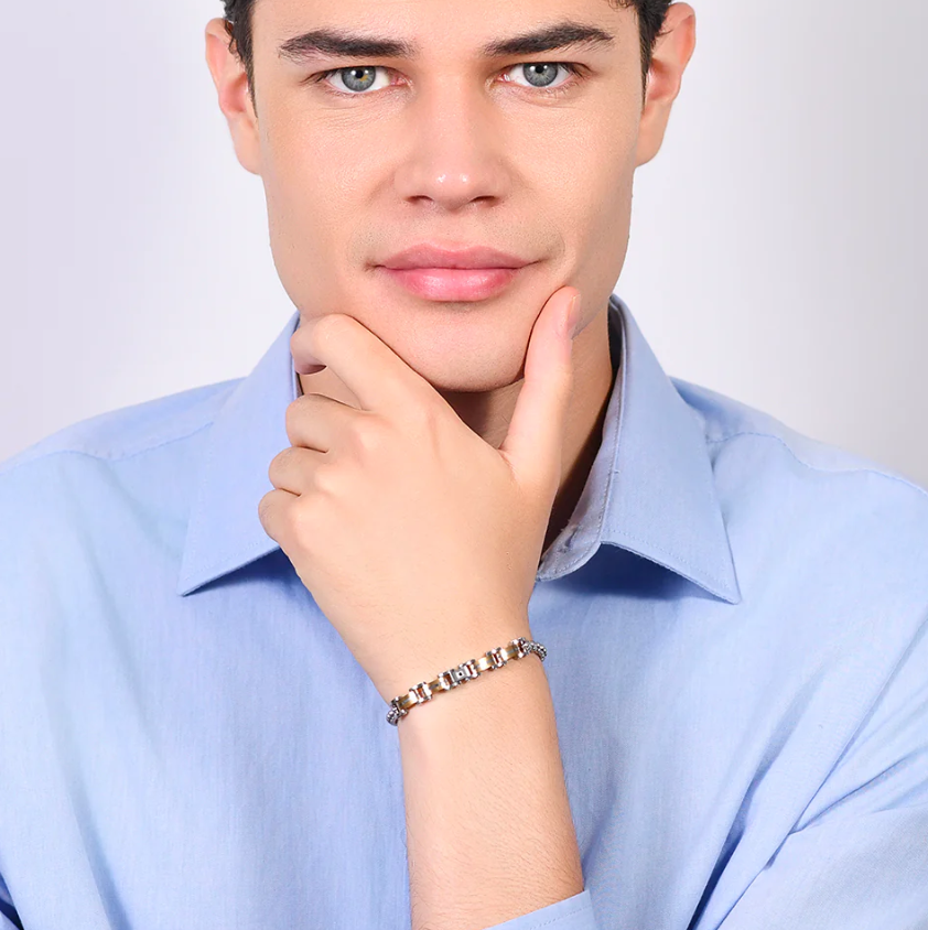 Bracciale Uomo in acciaio con zircone nero ed elementi centrali in acciaio Ip Gold. Lunghezza. 19+3 cm. Spessore catena: 4 mm. Misura elemento centrale: 60 x 6 mm. Aggiungi un tocco di eleganza e stile moderno al tuo look con questo sofisticato bracciale in acciaio, impreziosito da uno zircone nero e dettagli centrali in acciaio IP Gold. Questo gioiello incanterà con la sua combinazione di colori audaci e la sua raffinatezza contemporanea. Lo zircone nero, con la sua brillantezza e profondità, aggiunge un tocco di mistero e lusso al bracciale. Associato a potere e protezione, lo zircone nero esalta la personalità forte e decisa di chi lo indossa.