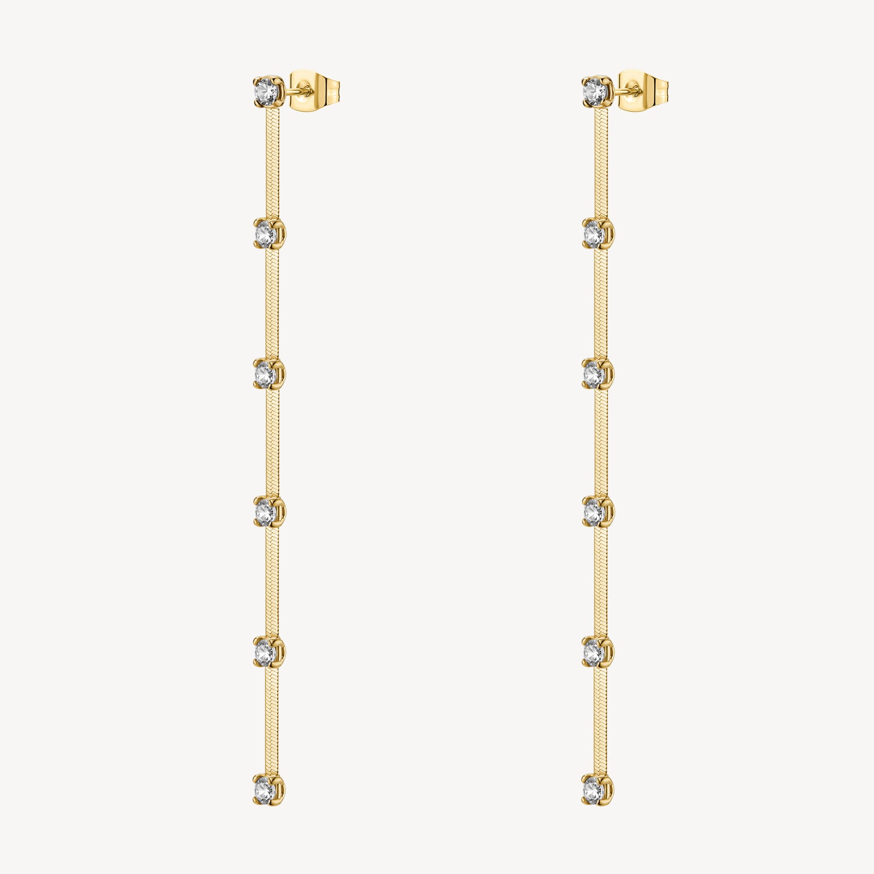 Orecchini pendenti in acciaio 316L e finitura pvd oro 14K, con cubic zirconia.