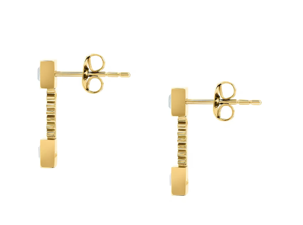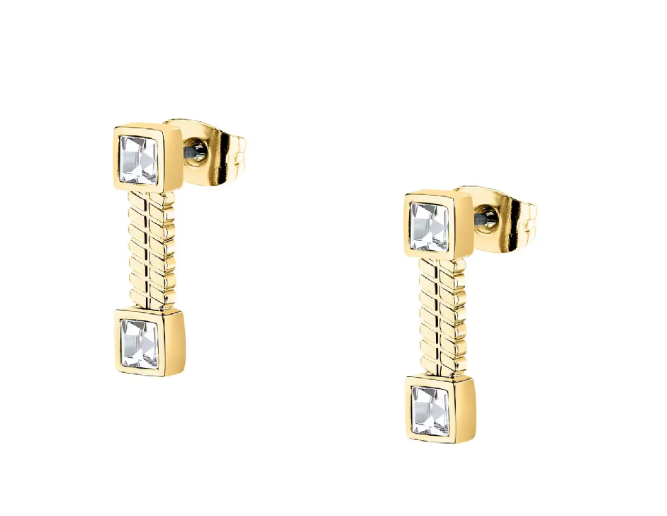 Gli orecchini sono realizzati in acciaio inossidabile 316L con trattamento pvd oro con due cristalli bianchi taglio quadrato.